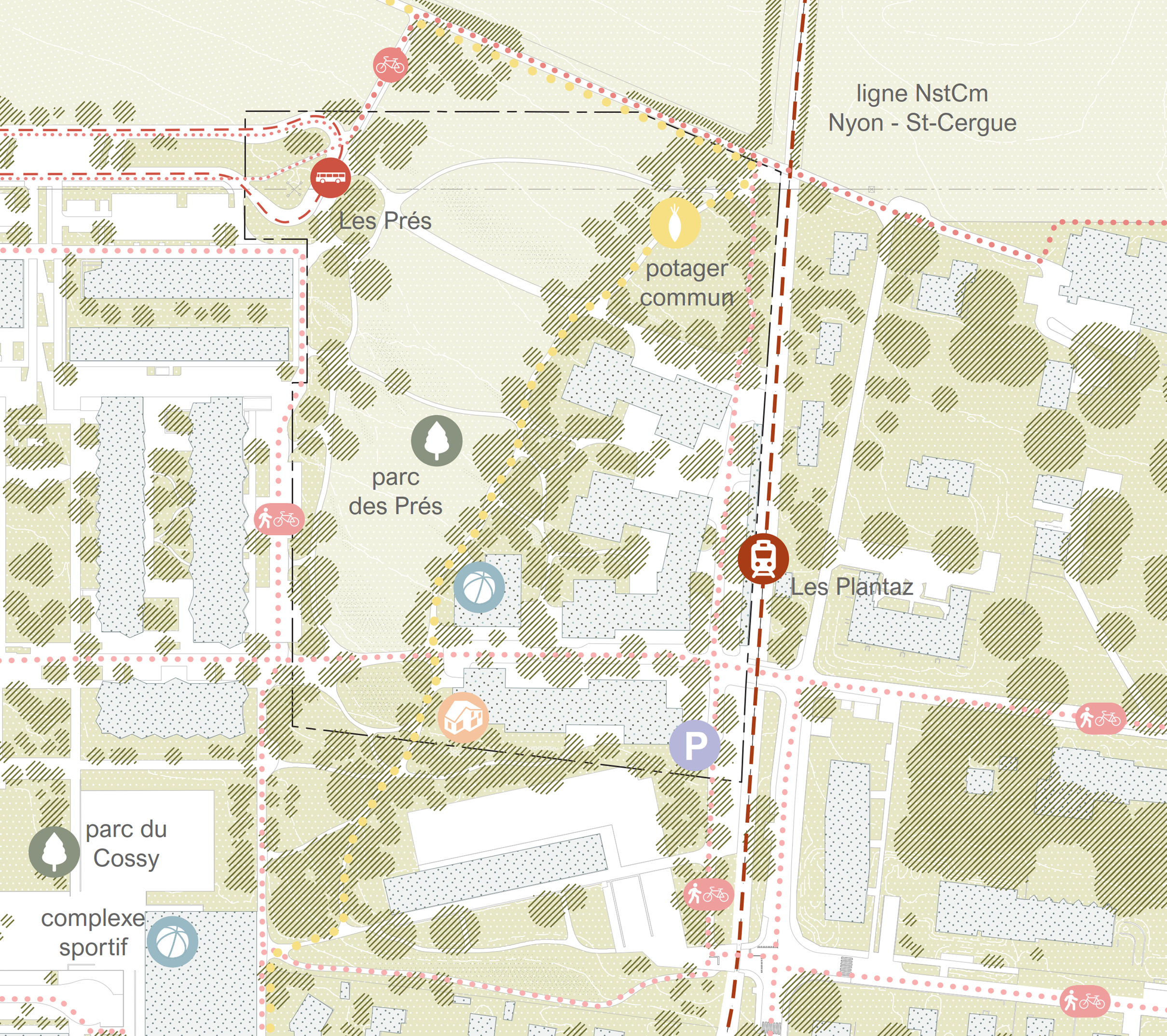 En matière de mobilité, le projet valorise l’accessibilité en modes actifs et en transports publics, notamment autour de la future halte ferroviaire du NStCM. Pour préserver ses qualités spatiales et écologiques — dont 86 % de pleine terre conservée — le projet a toutefois dû faire un compromis important : proposer un accès motorisé par le sud-est du site afin de préserver au maximum la prairie existante.